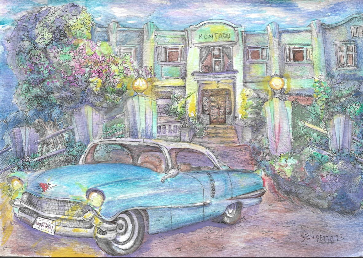 Montagu country hotel and prized cadillac using watercolour and pen