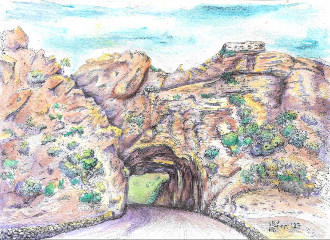 Montagu's Cogman's Kloof and Old English fort in watercolour and pen